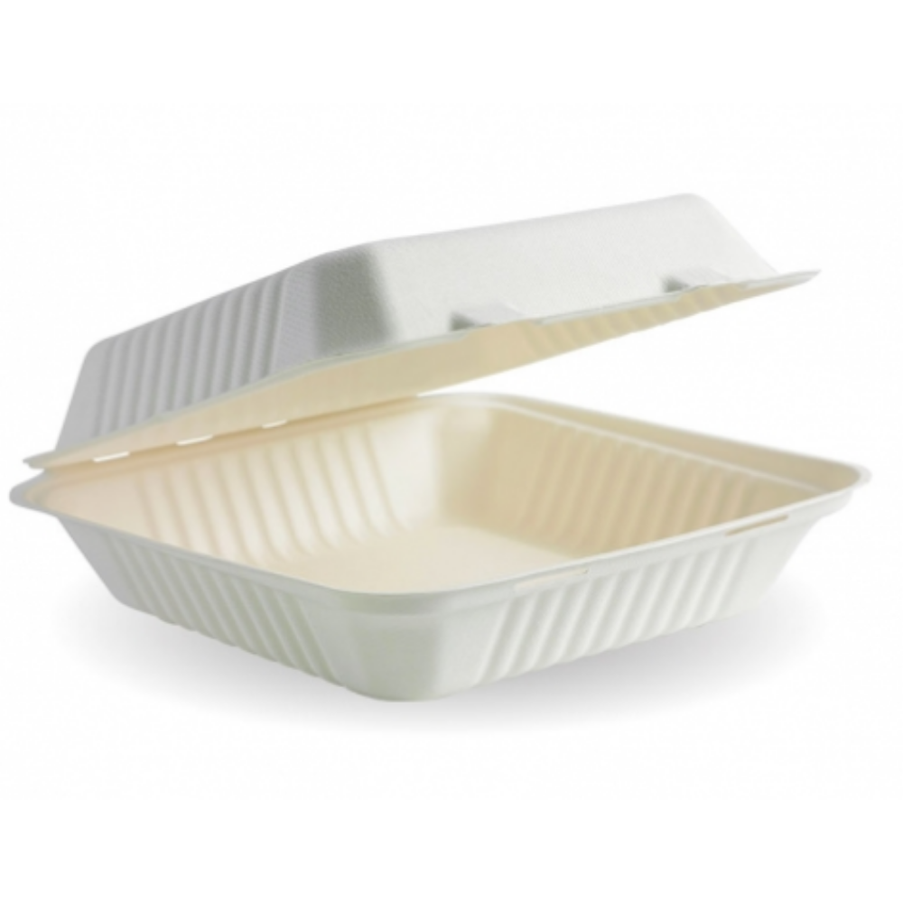 Plastic-free clamshells are made from rapidly renewable sugarcane pulp, a by-product of the sugar refining industry. White bagasse clamshell containers are an eco-friendly alternative to plastic takeaway containers.