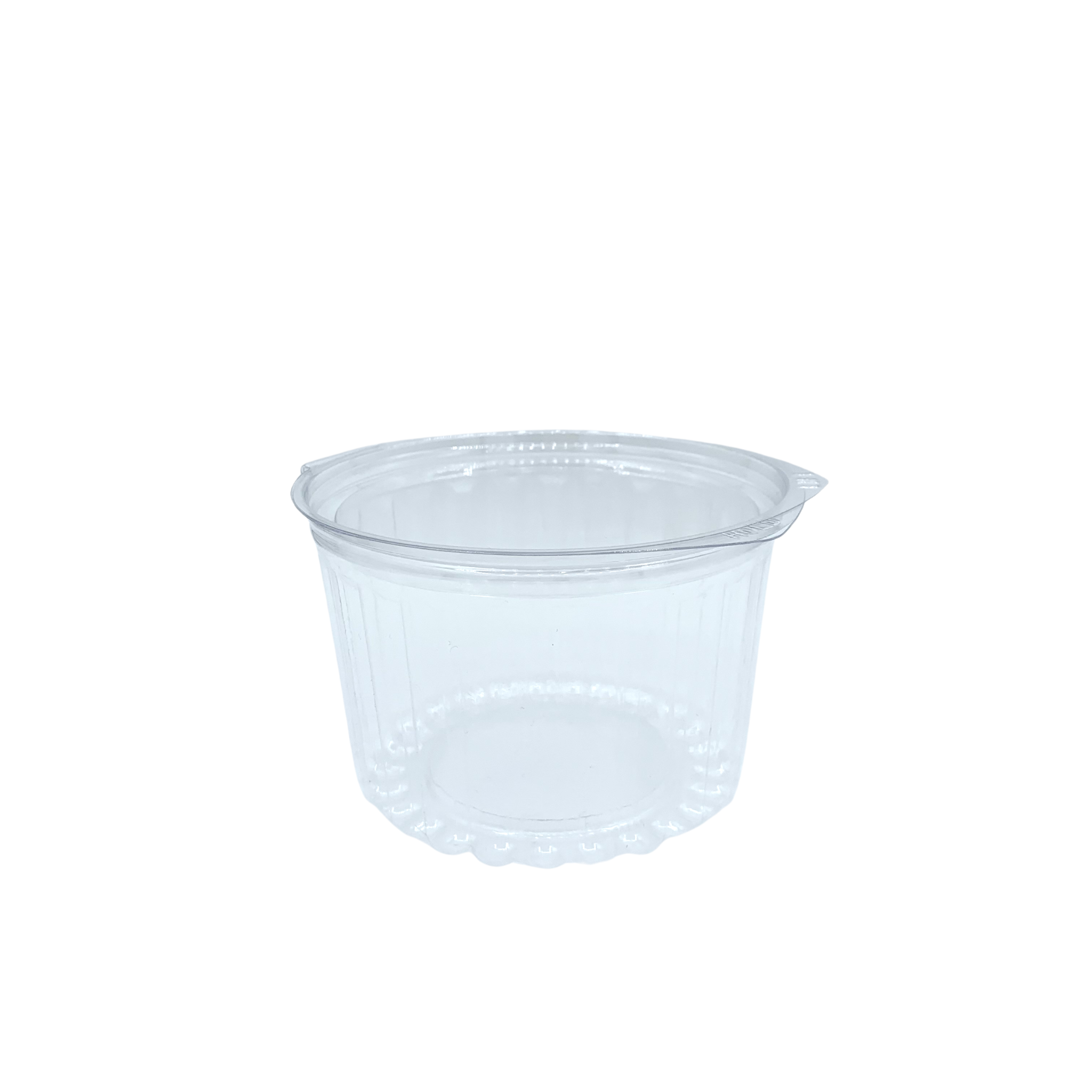 Clear container with attached clip on flat lid. 100% Recyclable.