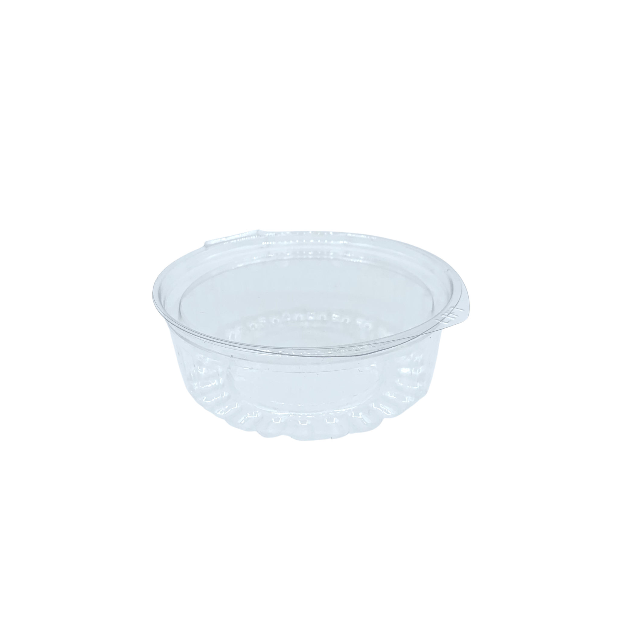 Clear container with attached clip on flat lid. 100% Recyclable.
